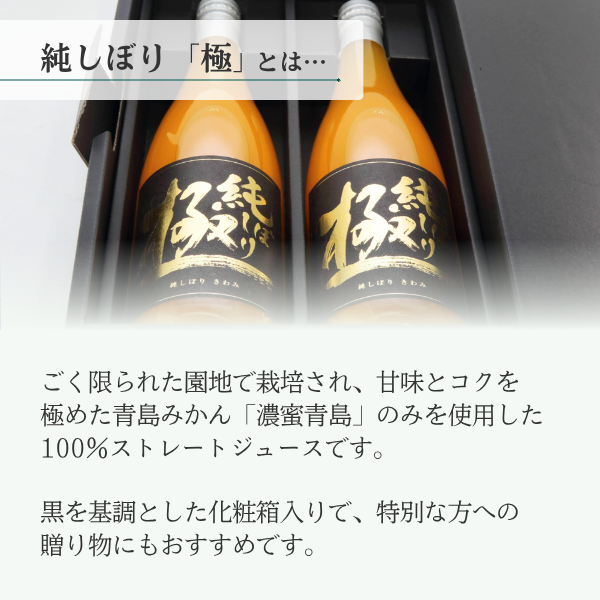JAみっかび公式オンラインショップをご利用いただき、誠にありがとうございます。 「純しぼり「極」」は、甘みとコクが最大限に引き出された、濃蜜青島の果実を絞った果汁100%ストレートジュースです。 「色」「味」ともにワンランク上の濃厚さを誇りこだわりを持って生産をしております。 これからも変わらぬ美味しさと品質をお届けできますよう、スタッフ一同よりよい商品のご提供に努めてまいります。 この度は当店のご利用誠にありがとうございました。 またのご利用をスタッフ一同、心よりお待ちしております。